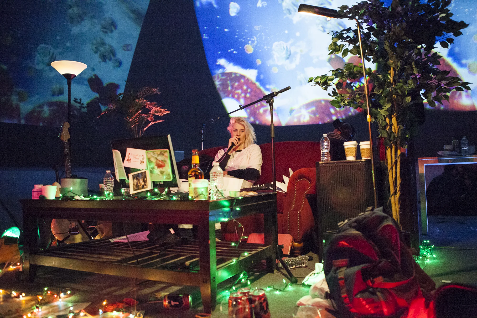 I Wanna Destroy is tied together by setting up parallel worlds. “Outside” the majority of the audience members experience a brand new song cycle by EMA, playing on a stage set up to look like a shabby apartment.